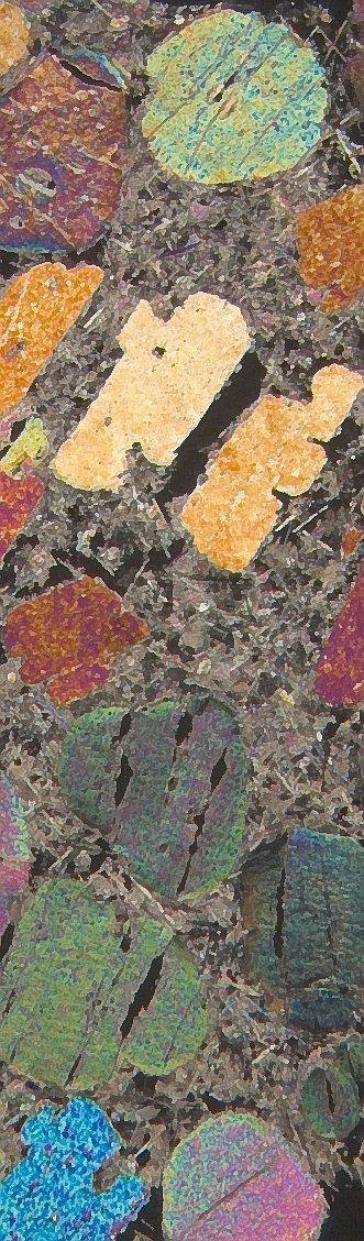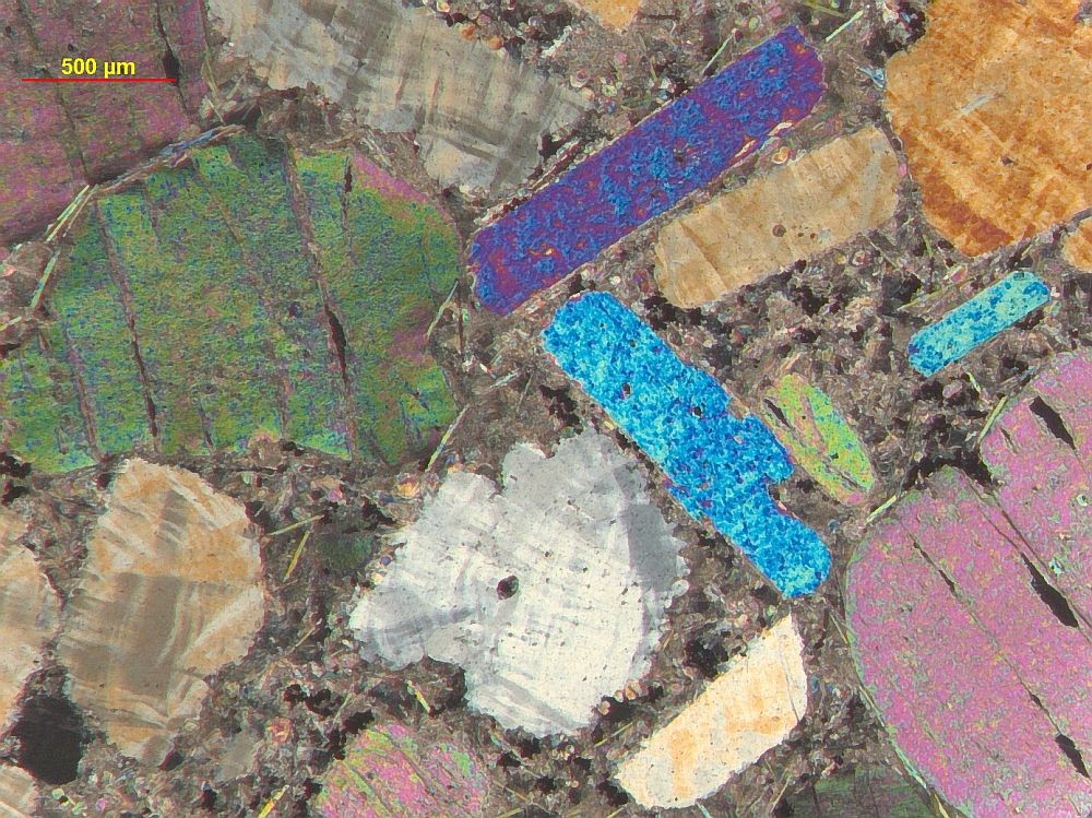 Dünnschliffaufnahmen (Polarisationsmikroskop) der Natrokarbonatit-Lava (xPol) von Frank Möckel:
