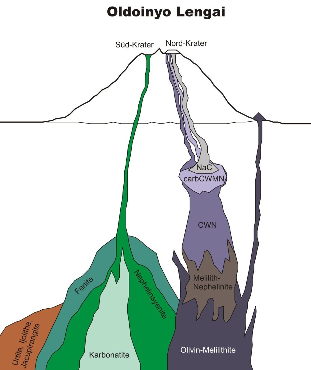 Die petrologische Entwicklung der Magmen des Oldoinyo Lengai ist sehr kompliziert und verläuft etappenweise. Die Existenz tief in den Erdmantel reichender Bruchstrukturen (Rift) ermöglicht die Schmelzenbildung in mehr als 100 km Tiefe. Das geringgradige partielle Aufschmelzen des Erdmantels in Anwesenheit von Kohlendioxid bei hohen Temperaturen und Drücken liefert ein olivinmelilithische Ausgangsmagma (OM). Durch Aufstieg in die Lithosphäre, Abkühlung und magmatische Differentiation kommt es zur Bildung von Melilith-Nepheliniten (MN), Combeit-Wollastonit-Nepheliniten CWN), karbonatisierten Combeit-Wollastonit-Melilith-Nepheliniten (carbCWMN). Durch Abspaltung (Nichtmischbarkeit von silikatischer und karbonatischer Schmelze bei Abkühlung und Druckentlastung) des karbonatischen Anteils des karbonatisierten Combeit-Wollastonit-Melilith-Nephelinit-Magmas kommt es zur Entstehung des Natrokarbonatit-Magmas (NaC).